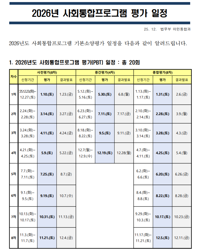 ★ 2026년 사회통합프로그램 평가 일정 ★ 신지원03 0 2시간전 2026.02.04 09:38 26년도 사회통합프로그램 기본소양평가 일정.pdf (114.7K) + 1 자세한 사항은 법무부 사회통합 프로그램에서 확인해주시길 바랍니다.