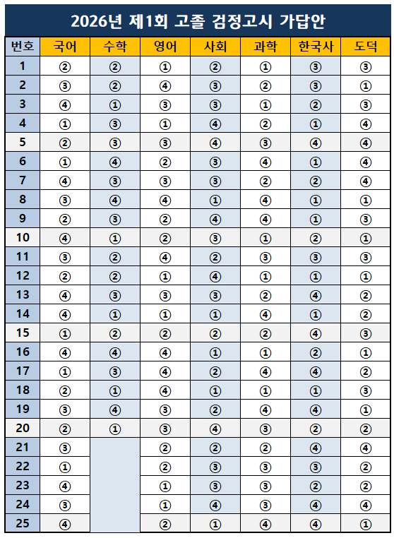 2026년 제1회 검정고시 가답안 안내 3 04.04 15:30 ※ 내부에서 빠르게 채점하여 제공되는 자료이므로 최종 가답안과 일부 차이가 있을 수 있으니 참고 부탁 드립니다.최종가답안 : 오후 6시 공개